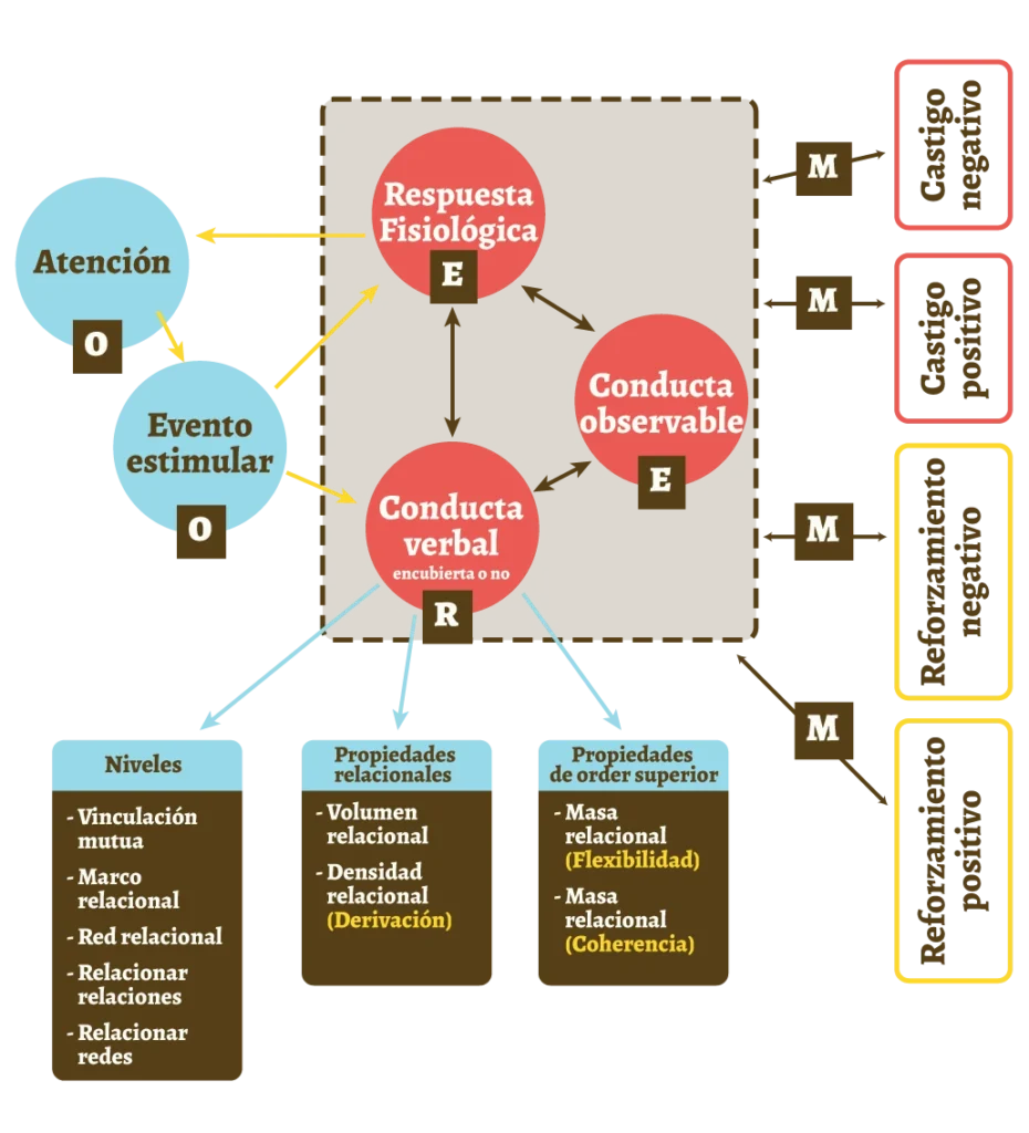 “La RFT postula que el antecedente estimular de eventos interactúa con las relaciones verbales que están enlazados con el evento estimular, y esto está combinado con procesos que elicitan o evocan la respuesta observable que ultimadamente toma contacto con contingencias de reforzamiento o castigo” (p. 34).