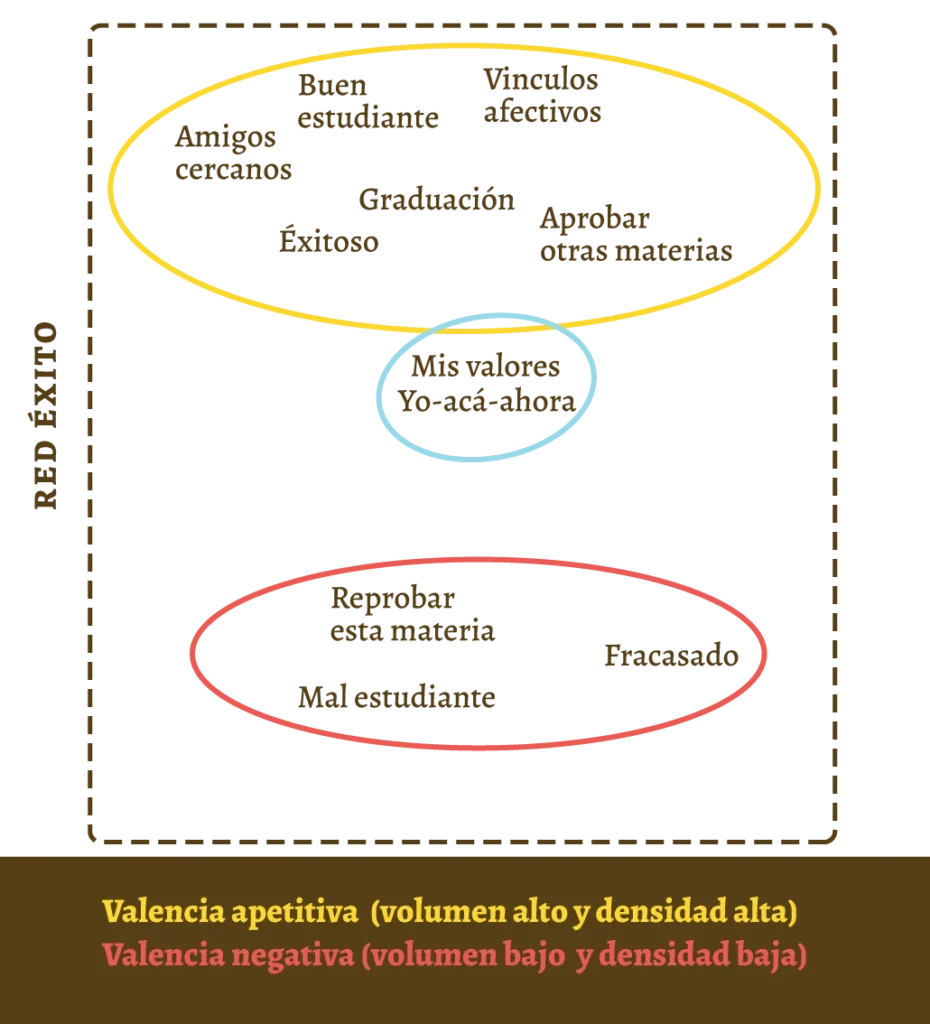 En el caso contrario, una red que evoque aproximación hacia aquello que le es valioso está conformada por más elementos en su apartado de valencia apetitiva: {buen estudiante, exitoso, amigos cercanos, graduación, resaltar en clase, saludable y fuertes amistades}. En este caso, los marcos deícticos {yo-acá-ahora} están próximos a esta última red, así como sus valores. Mientras que la red aversiva está conformada por elementos distantes entre ellos como {mal estudiante, poco exitoso y equivocarse en clase}. Distinto al anterior, está conformada por una red apetitiva de gran volumen y densidad relacional, en paralelo la red aversiva posee poco volumen y densidad relacional. Una vez más, se evidencia que la función de una red relacional es el resultado de las relaciones establecidas.