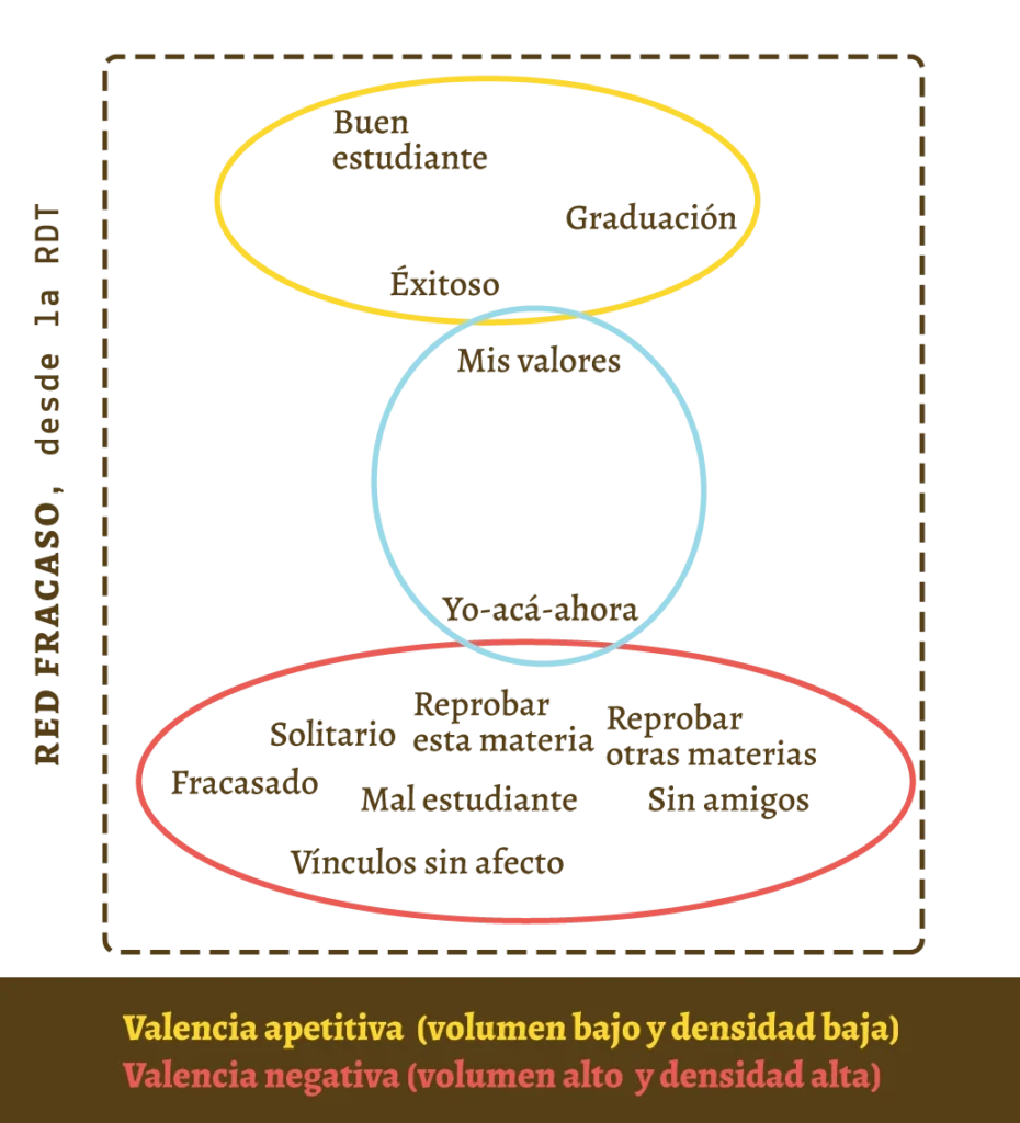 Anteriormente, teníamos la red de fracaso con valencia aversiva. Ahora, la RDT nos permite afirmar que dentro de esta red existe un volumen y una densidad relacional altos entre elementos como {poco saludable, fracasar esta clase, fracasar otras clases, pocos amigos, mal estudiante, sin amigos, poco exitoso y malas amistades}. Dada la cantidad de elementos relacionados, se podría decir que hay una masa relacional significativa, lo que dificulta un cambio conductual en las respuestas evitativas del consultante. Incluso, uno podría agregar elementos como el {yo-acá-ahora} como marcos deícticos que están más próximos a esta red de fracaso. Mientras tanto, dentro de este mismo análisis, la red de éxito está formada por pocas palabras {buen estudiante, exitoso y graduación} implicando que se trata de un bajo volumen y densidad relacional. Quizá estos últimos elementos sean cercanos a sus valores, pero distantes del {yo-acá-ahora}.