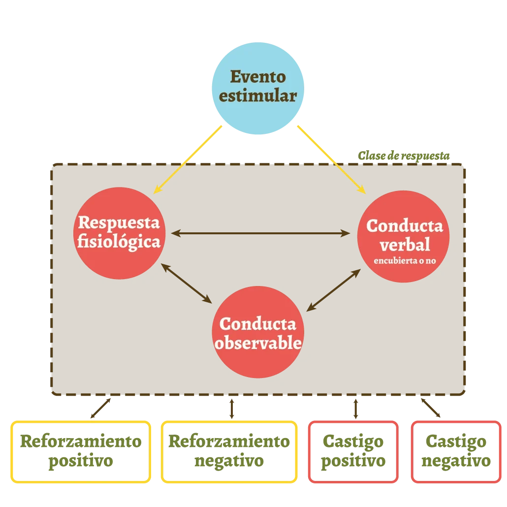 Más adelante, Schachter y Singer conciben que la emoción está compuesta de una respuesta fisiológica y una respuesta cognitiva. O sea, una activación fisiológica como las palpitaciones y un pensamiento que intenta anticipar el peligro inminente. Aunque, por supuesto, desde el conductismo se entiende que todo es conducta, incluso aquellos eventos privados como los ya mencionados. Sin embargo, la manera en que estos eventos privados tienen contacto directo con las contingencias es a partir de la conducta pública/observable (Dixon et al., 2023).