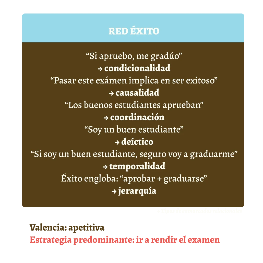 Por otro lado, la red del éxito posee una valencia apetitiva, evocando una función de aproximación. Esta se construye a través de relaciones como suponer que “aprobar el curso” provoca “graduarse” (marcos de causalidad), y “graduarse” significa llegar al éxito (marcos de condicionalidad). Además, “aprobar el curso” es igual a “ser un buen estudiante” (marcos de coordinación), mientras que “ser un buen estudiante” se relaciona con su persona, “soy un buen estudiante” (marcos deícticos). Este pensamiento, vinculado a “graduarse”, deriva en “soy un buen estudiante, voy a poder graduarme” (marcos de temporalidad). Por último, “éxito” engloba a “aprobar el curso” y “graduarse” (marcos jerárquicos).
