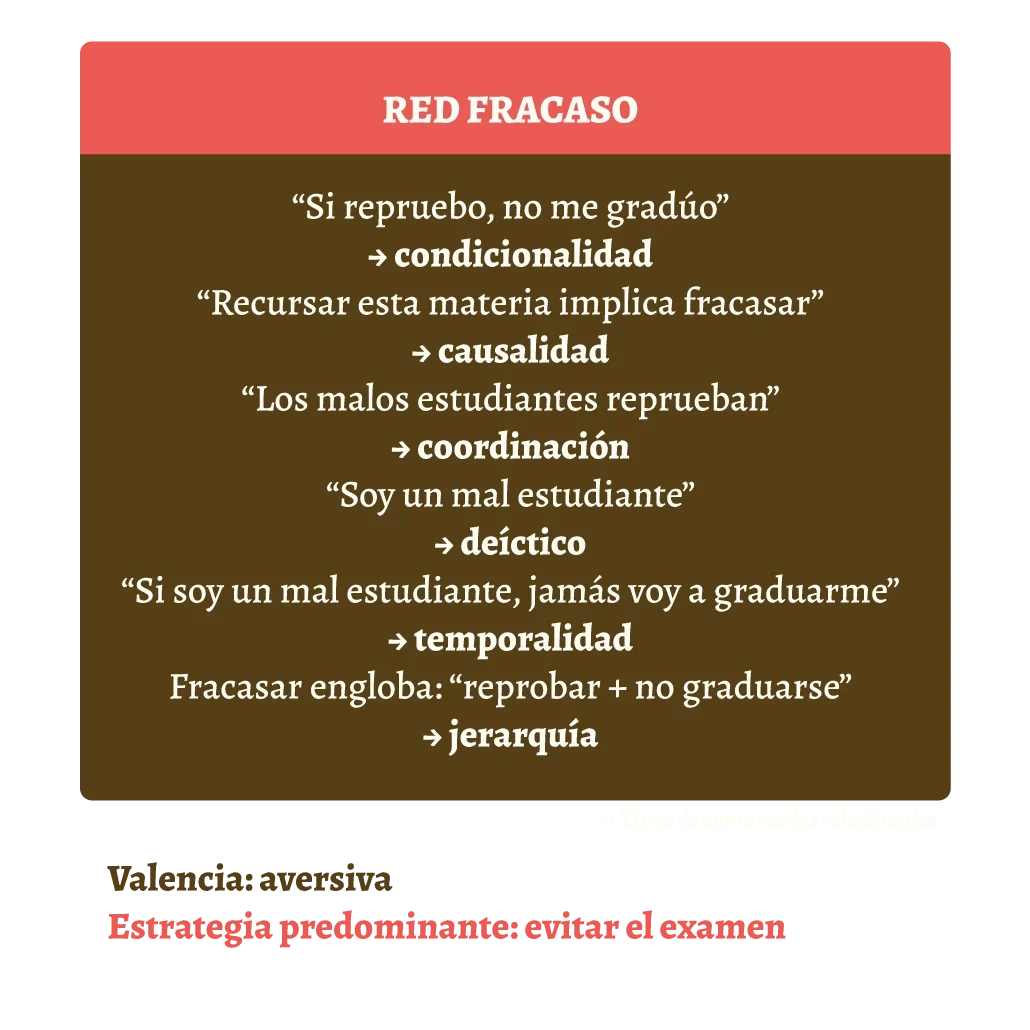 Por un lado, la red del fracaso posee una valencia aversiva, evocando una función conductual de evitación. Esta se construye a través de relaciones como suponer que “reprobar la materia” provoca “no graduarse” (marcos de causalidad), y de manera similar, en caso de “no graduarse” este implica fracasar (marco de condicionalidad). Además, “reprobar el examen” es igual a “ser un mal estudiante” (marcos de coordinación), mientras que “ser un mal estudiante” se relaciona consigo mismo, “soy un mal estudiante” (marcos deícticos). Este pensamiento, vinculado a “no graduarse”, deriva en “soy mal estudiante, no voy a poder graduarme” (marcos de temporalidad). Por último, “fracasar” engloba a “reprobar” y “no graduarse” (marcos jerárquicos).